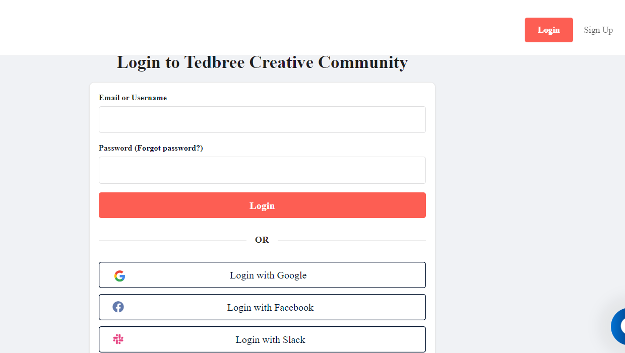 To log in to the Tedbree community, you must have signed up into the Tedbree community and now have a valid username/Email and password. Log on to community.tedbree.com, click on login and enter your username and password.You can also login using Google, Facebook or Slack.